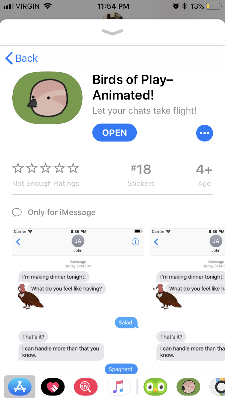 Screen Shot of the App Store Store Front for Birds of Play